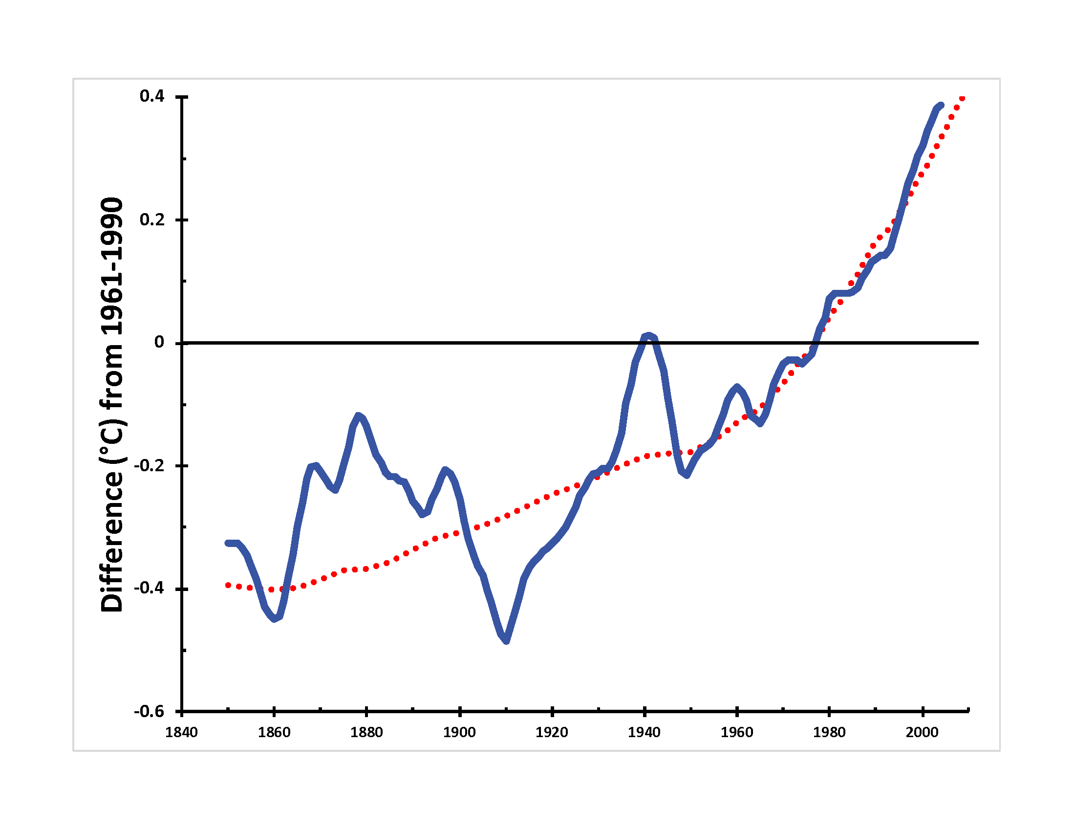 Temperatures from Figure 3.4(b) of Trenberth, K.E., P.D. Jones, P. Ambenje, R. Bojariu, D. Easterling, A. Klein Tank, D. Parker, F. Rahimzadeh, J.A. Renwick, M. Rusticucci, B. Soden and P. Zhai, 2007: Observations: Surface and Atmospheric Climate Change. In: Climate Change 2007: The Physical Science Basis. Contribution of Working Group I to the Fourth Assessment Report of the Intergovernmental Panel on Climate Change [Solomon, S., D. Qin, M. Manning, Z. Chen, M. Marquis, K.B. Averyt, M. Tignor and H.L. Miller (eds.)]. Cambridge University Press, Cambridge, United Kingdom and New York, NY, USA. Predictions calculated using T = 0.5∆F and ∆F = 5.35