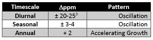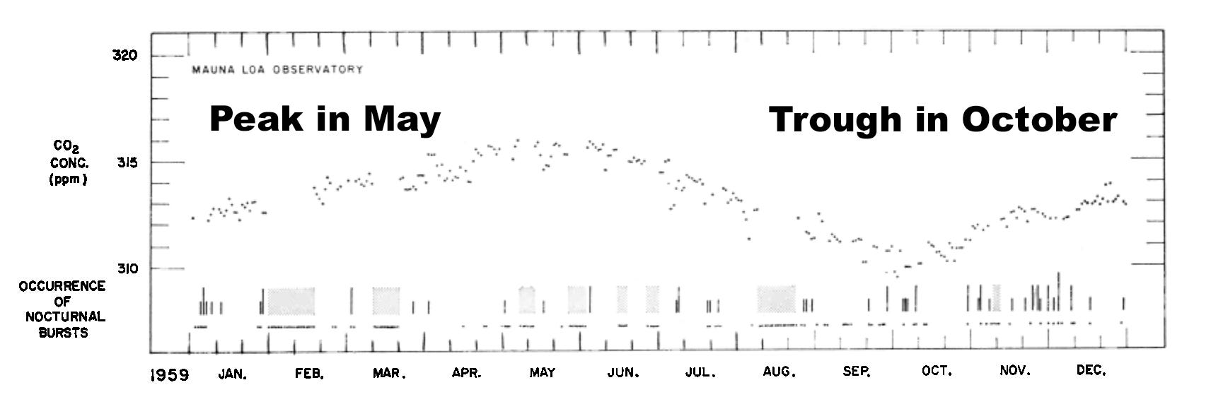 There’s a broad range of amplitudes in diurnal measurements because different microclimates show different changes due to vegetation differences, and some climates (e.g., deserts) have little to no ground cover. Initially, Keeling confirmed earlier reports that CO2 levels have a diurnal cycle even in rural areas, noting that “plants are able to reduce the concentration of carbon dioxide to significantly lower values than have ever been observed under natural conditions.”