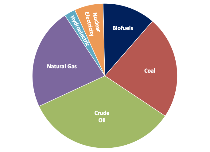 I’ve plotted this in rough order of introduction and on a vertical log scale so that the growth of energy use is roughly linear with time, following human population trends. Unfortunately, this distorts the vertical axis (later additions seem less impactful). To correct for that perception, here’s a pie chart of the same data for the year 2000: