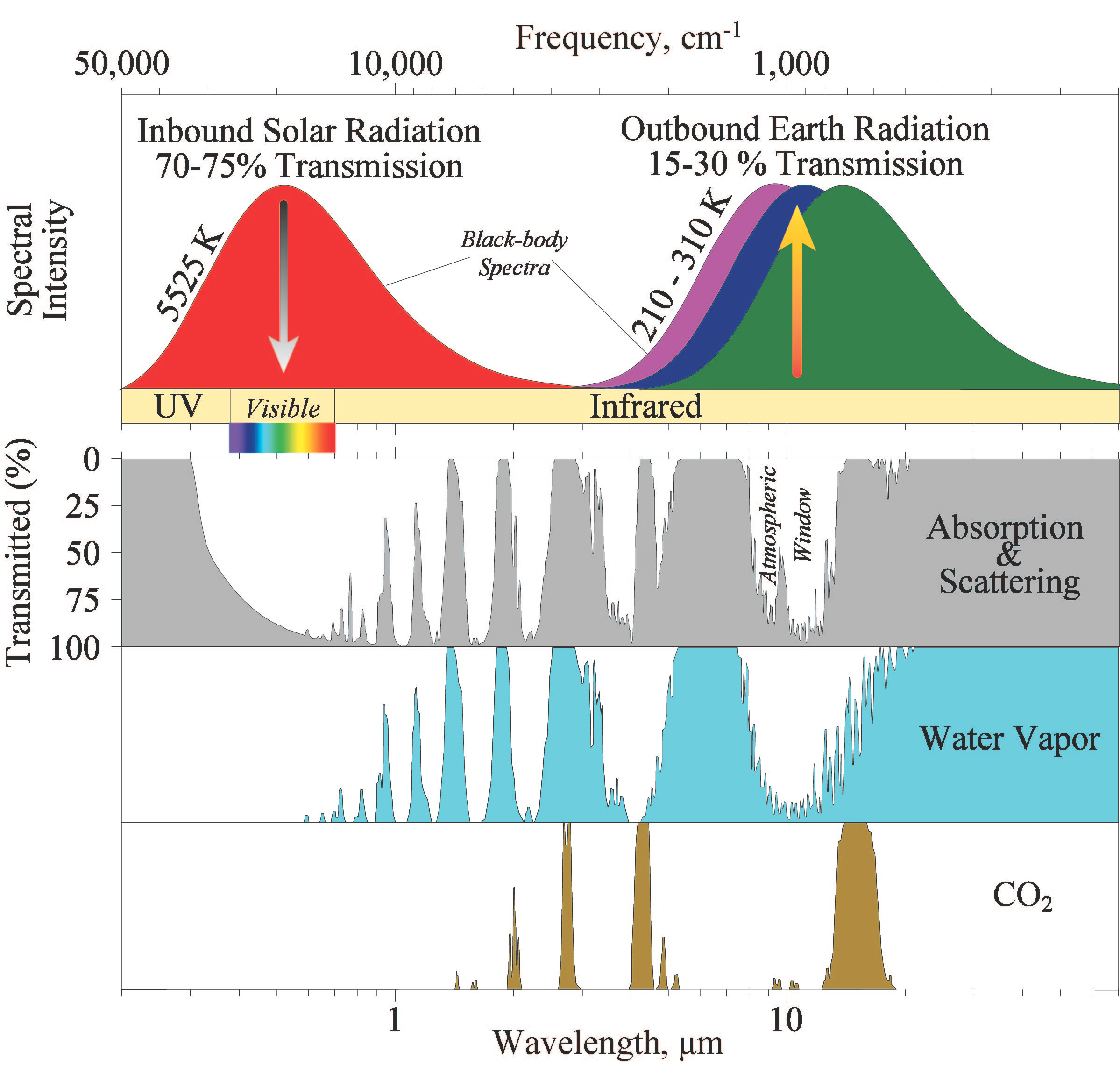 Walking through this figure, from top to bottom: What’s shown is the part of the electromagnetic spectrum that ranges from the ultraviolet (UV) through the visible (what we can see) to the infrared. From basic physics, electromagnetic radiation is emitted from all objects. In this process, all wavelengths are present, with a peak that depends on the object's temperature, creating a “black-body spectrum”. The top panel shows the (simplified) black-body spectra of both the sun and the earth. The sun confers in most of its radiant energy with wavelengths in the visible while Earth radiates most of its energy to outer space with wavelengths in the infrared. Surfaces of different temperatures have different spectra; What is shown is a progression of black-body spectra for Earth between 210K (about -60°C/-80°F) and 310K (37°C/98°F)