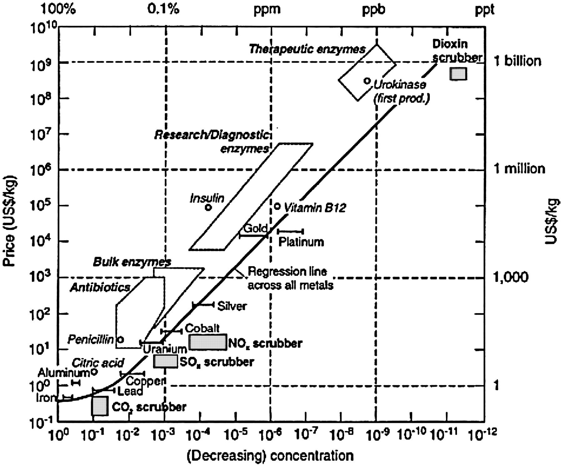 There are many issues with this empirical plot—it follows the general “rule” that logarithmic-scale plots are invariably linear, so interpretation is muddled, it lists price (what customers pay) rather than cost, so fails to consider profits, and it plots very diverse materials, including biologics, precious metals, and pollutants on the same graph. Nevertheless, it’s a useful illustration. The central line is drawn through commodity metals, ranging from iron to gold. Biologics, which have value in health, are more valuable than commodity metals, and pollutants like sulfur and nitrogen oxides (SOx and NOx) are the least valuable. Note where CO2 lies on this graph. It’s below a dollar a kilogram (or $1,000 per ton), but only because the feedstock is in the 1-10% range—direct air capture starts with 0.05%, i.e., in the area of the ‘NOx scrubber’ box. This suggests that it will be at least $1,000 per ton to remove carbon dioxide from the atmosphere, and we’ve already released a trillion tons into the air! To a first approximation, engineering the removal of the carbon dioxide, we’ve already emitted will cost the world $1 quadrillion! That’s more than 10 years of the world’s GDP.