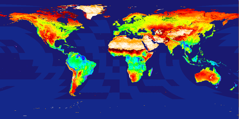 I have kept the two images separate because different data is measured, of necessity. However, both images explain the annual decrease in carbon dioxide during the summer months. By inspection, there is more photosynthetic activity and/or chlorophyll in the Northern Hemisphere than in the Southern Hemisphere, both on land and in the ocean. It is highest on land near the equator and gets smaller at higher latitudes, with clear arid or desert land bands to either side. There is a substantial amount of aquatic photosynthesis because of nutrients distributed near shorelines, even in the polar regions. For now, I’m going to set aside aquatic photosynthesis because the primary source of carbon in seawater is dissolved bicarbonate ions rather than the main target of concern, atmospheric carbon dioxide, and (as established earlier), the dissolution rate is slow enough to make a difference.2