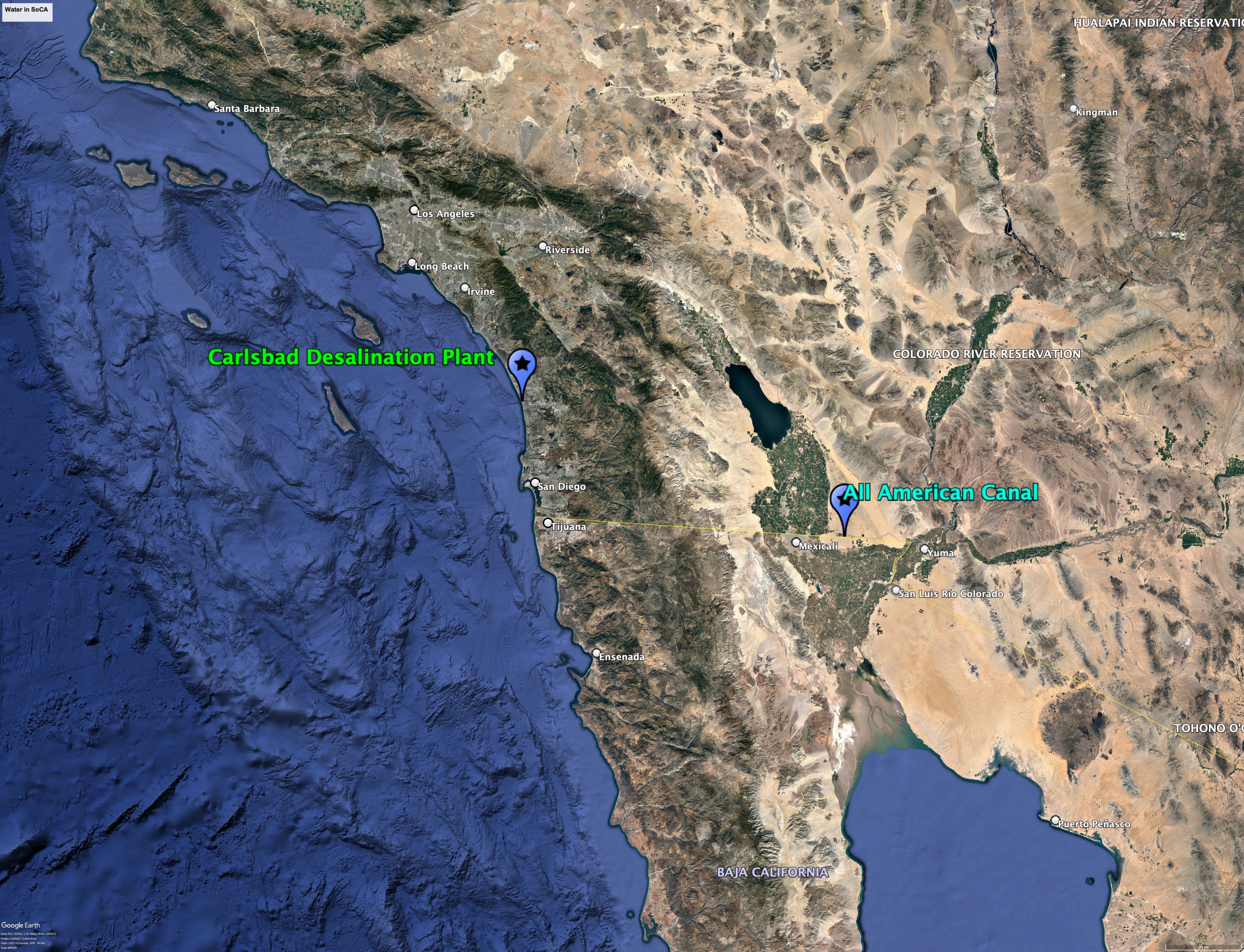 I’ve highlighted two features. First, there’s the Carlsbad desalination plant , the largest desalination plant in the Western hemisphere. Second, only about 100 miles to the east is the All American Canal , which diverts fresh water from the Colorado River to the US side of the border, generating the green agricultural area in the middle of the desert, California’s Imperial Valley. Note how much greener the desert is on the American side of the border! [As a side note, the “lake” just to the north is “The Salton Sea”. Its water is much too salty for irrigation—it’s the remnants of a prior engineering failure caused by faulty canal construction!]