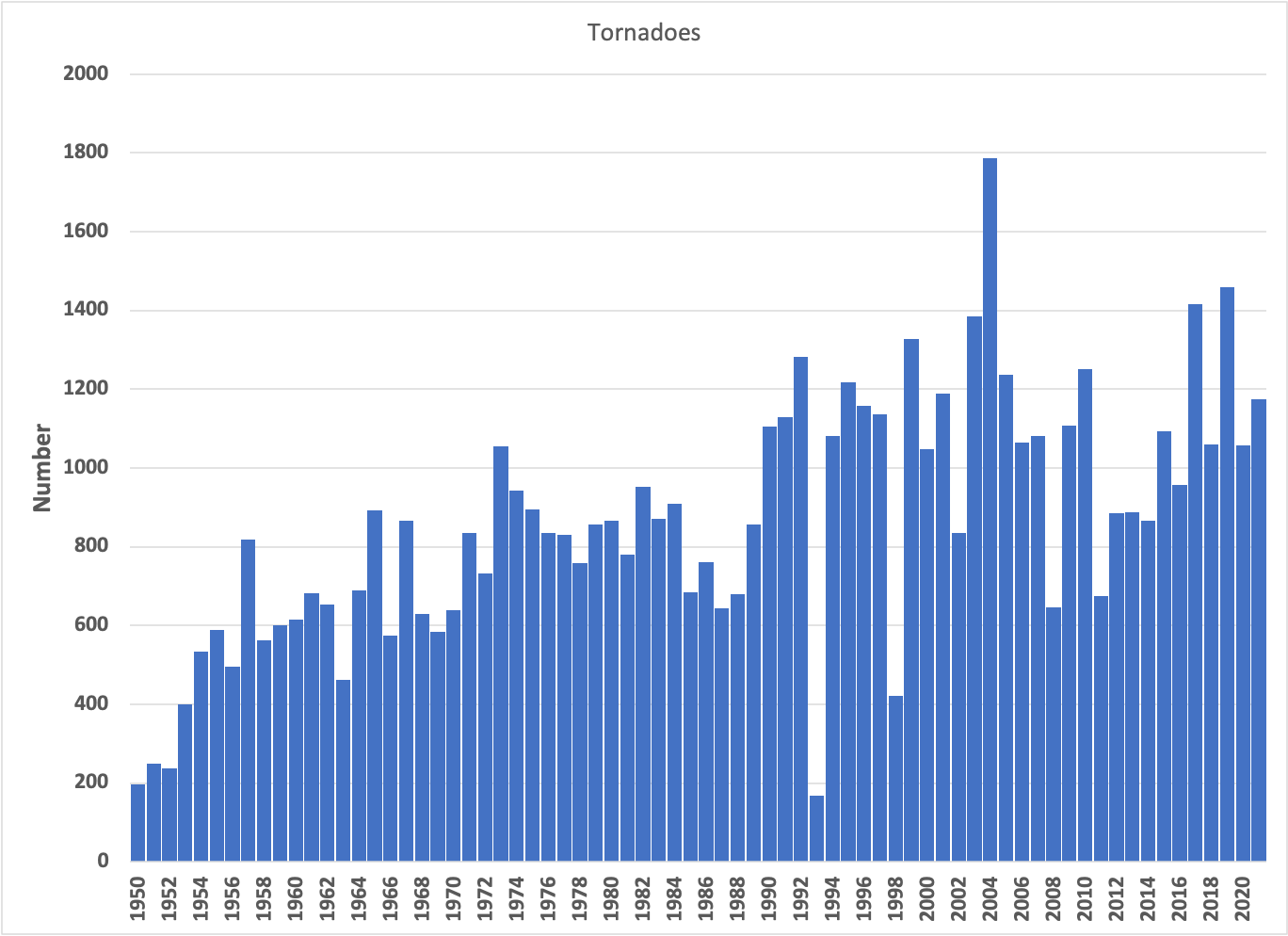 While it looks like there are more in recent times, it’s an artifact of how much better we’ve gotten at measuring smaller tornadoes—see the following analysis from National Geographic2:
