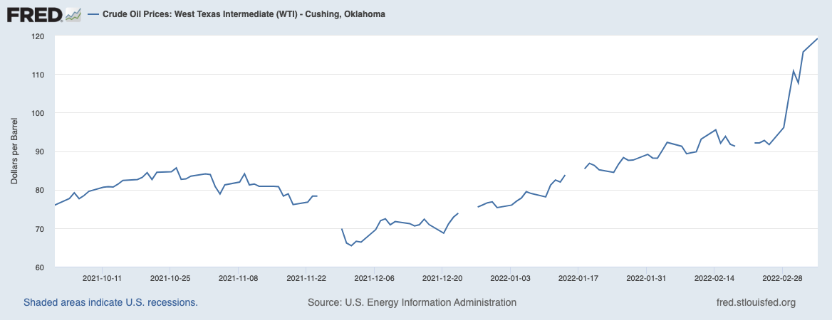 Now to the question-of-the-day: Russia supplies around 16% of the world’s oil. If that abruptly went away, how much would gasoline prices rise? To answer this quantitatively drags us into the economic fog since we need to know the relationship between price and supply when supply is suddenly restricted. This concept in economics is called “elasticity”, a number that changes over time as the marketplace adjusts to new circumstances. Like most quantitative economics, the idea is fuzzy and imprecise. And the only way to predict the future is to model it based on these woefully imprecise numbers.