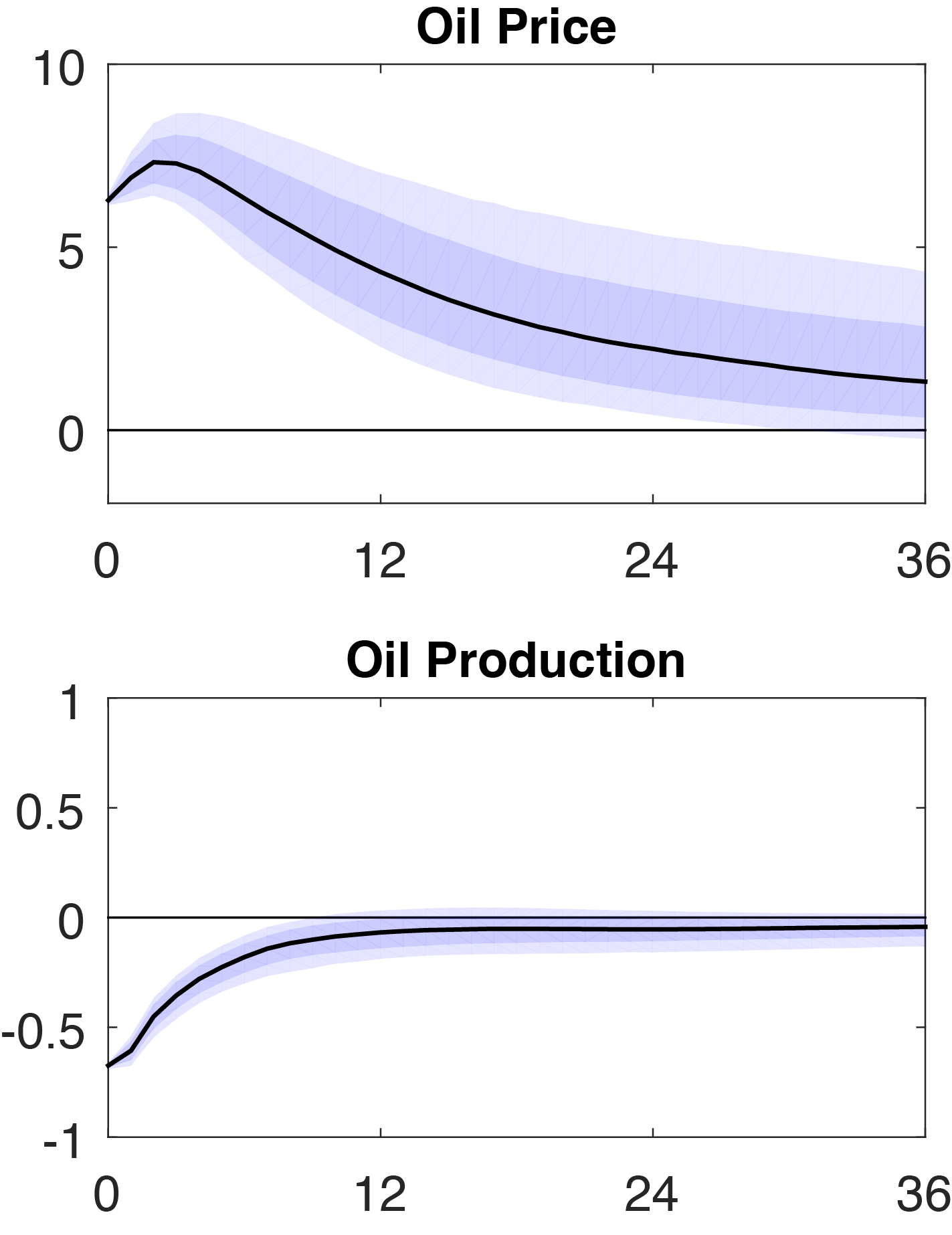 In this case, this model says that professional economists (at least a few of them) estimate that a production shock of -0.75% leads to a 6% increase in prices, which dissipates over the next 36 months as new supplies come online.