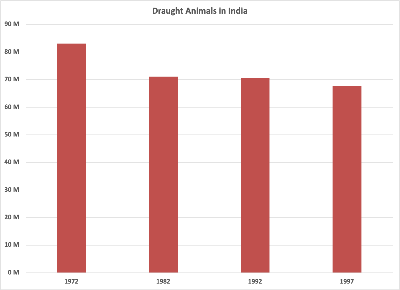 While the population of animals used for farming is declining, small farmers in India cannot afford a tractor. So, even though the technology for mechanized tractors dates from the 19th century, many agriculture still involves “old” technology—oxen. And, of course, that’s a transition that the “When?” group wants the world to undo!