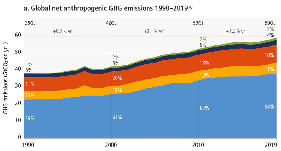 Total net anthropogenic GHG emissions have continued to rise during the period 2010–2019, as have cumulative net CO2 emissions since 1850. Average annual GHG emissions during 2010-2019 were higher than in any previous decade, but the rate of growth between 2010 and 2019 was lower than that between 2000 and 2009. (high confidence)