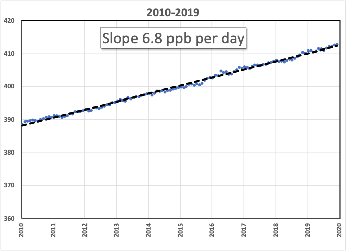 From 2010 to 2019, the CO2 in our atmosphere increased by an average of 6.8 parts per billion per day, in other words, 20% faster. It doesn’t matter whether that’s caused by increased emissions from China or the contribution of “land use, land-use change, and forestry”! The consequences are identical.