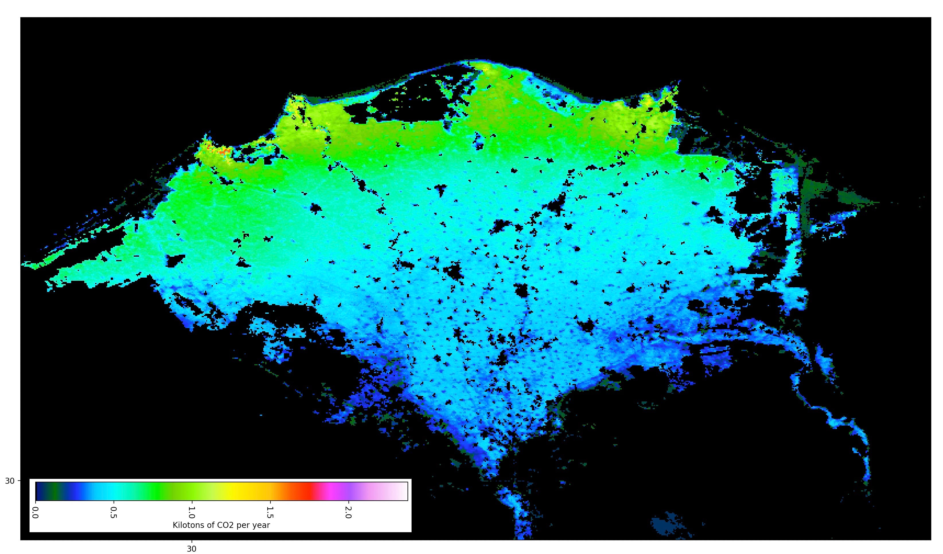 The shaded area is about 8.3 million acres (most of the agricultural land in Egypt) and is irrigated by 40,000 km of canals. It provides a good base case for what irrigation of the desert might provide in terms of carbon absorption potential. Irrigation of this land uses a little less than 3 feet of water per acre7. If a year-round crop such as sugarcane is used, gross absorption is 35 tons of CO2 per acre with 25 tons harvested, leaving 10 tons assimilated into biomass.8