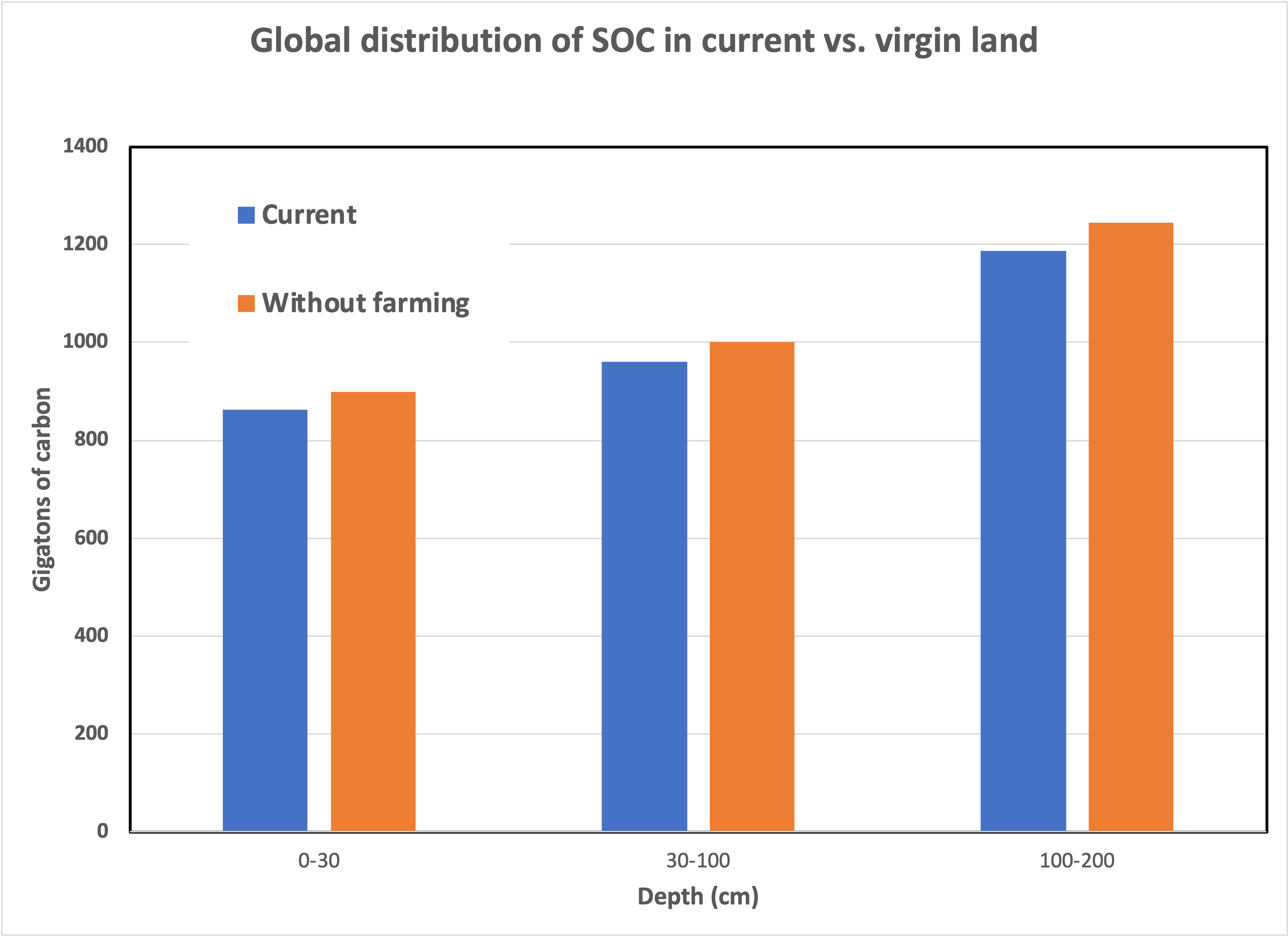 Let’s return to the questions. The “carbon debt” is what farmers owe to the planet in exchange for the SOC that’s been released due to all farming practices over several millennia. The “no land use” baseline projects that farming (and hence human societies) never existed. Over time, the “debt” looks like this: