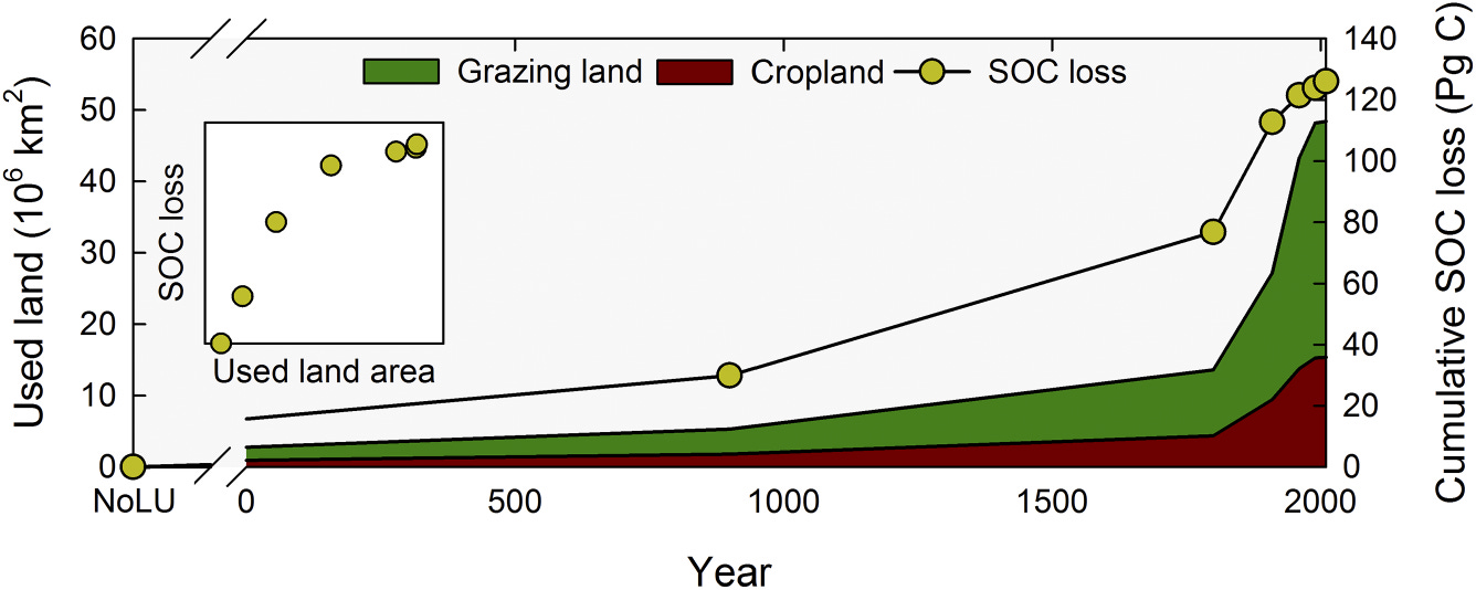 In their analysis, the authors sourced a large dataset of SOC measurements compiled by The International Soil Resource & Information Center (ISRIC), a repository of all kinds of third-party soil measurements, including SOC, up to 2 meters (6 feet) in depth. They then obtained a second large dataset of human land use dating to 10,000 BC (HYDE 3.2) compiled by the Government of the Netherlands and reported here3. It makes intuitive sense that how humans use land resources will impact SOC, so there should be a correlation. [That answers one question: the study went back to 10,000 BC because that’s as far as the data allowed.]