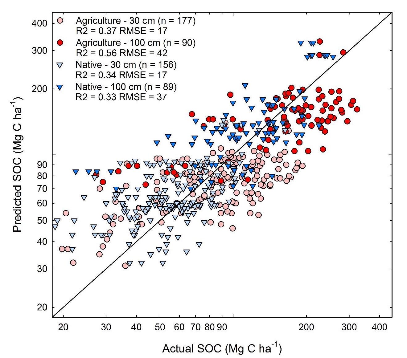 To validate the model’s predictive power, the authors identified soil pairs of native (uncultivated) land in the same area as cultivated land. Then, they used the model to compare actual measurements to predicted. Here’s what they report":