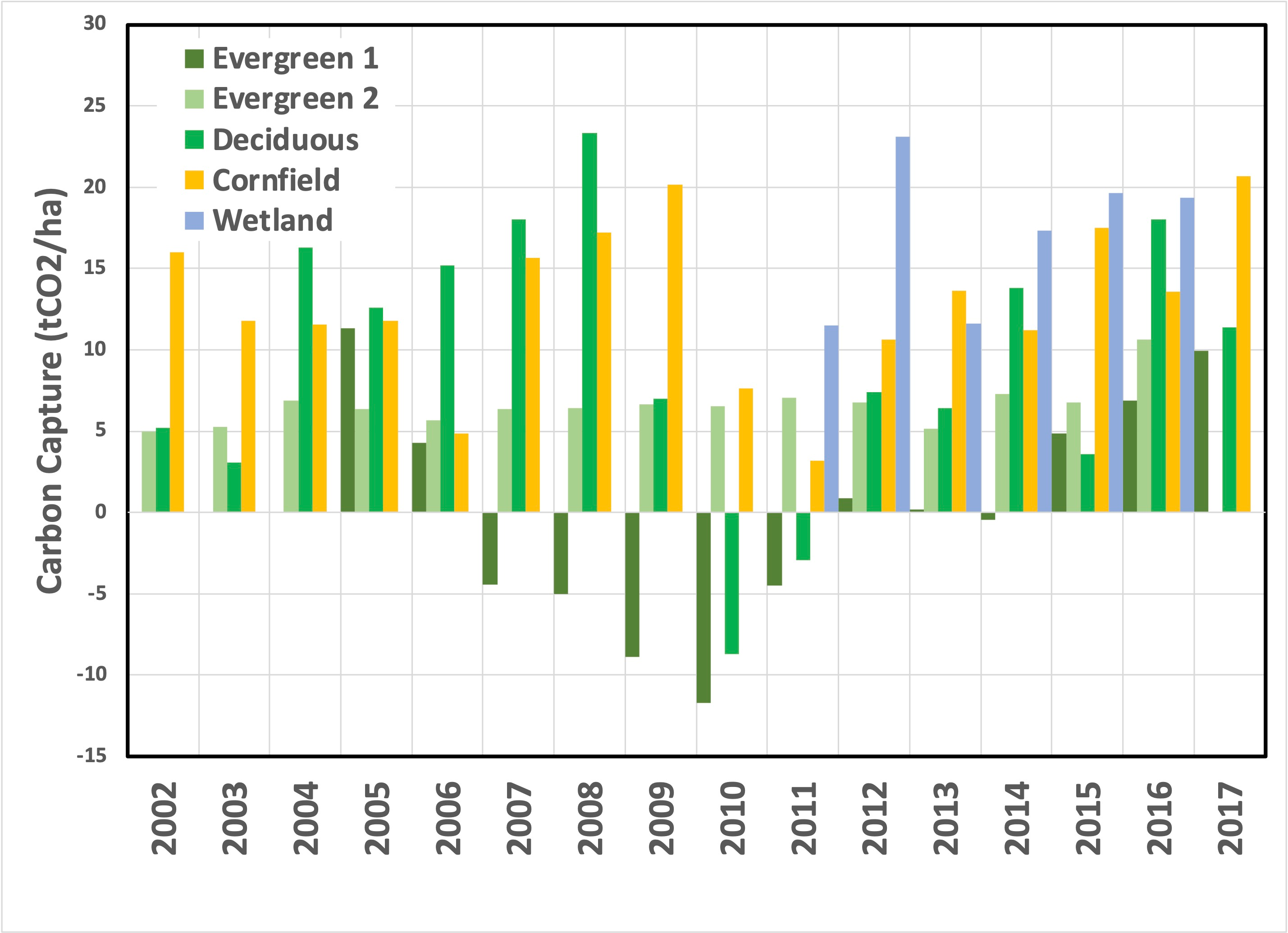 As a general observation, in most years, more carbon is captured than released, which is good for controlling the atmosphere's composition. In a typical cornfield, a lot of that carbon is harvested and used by humans, a loss that Eddy Flux Covariance would not measure. But, the conclusion it’s not crystal clear. The data isn’t available for all years, and even the two pine forests differ, with some years showing net carbon release.