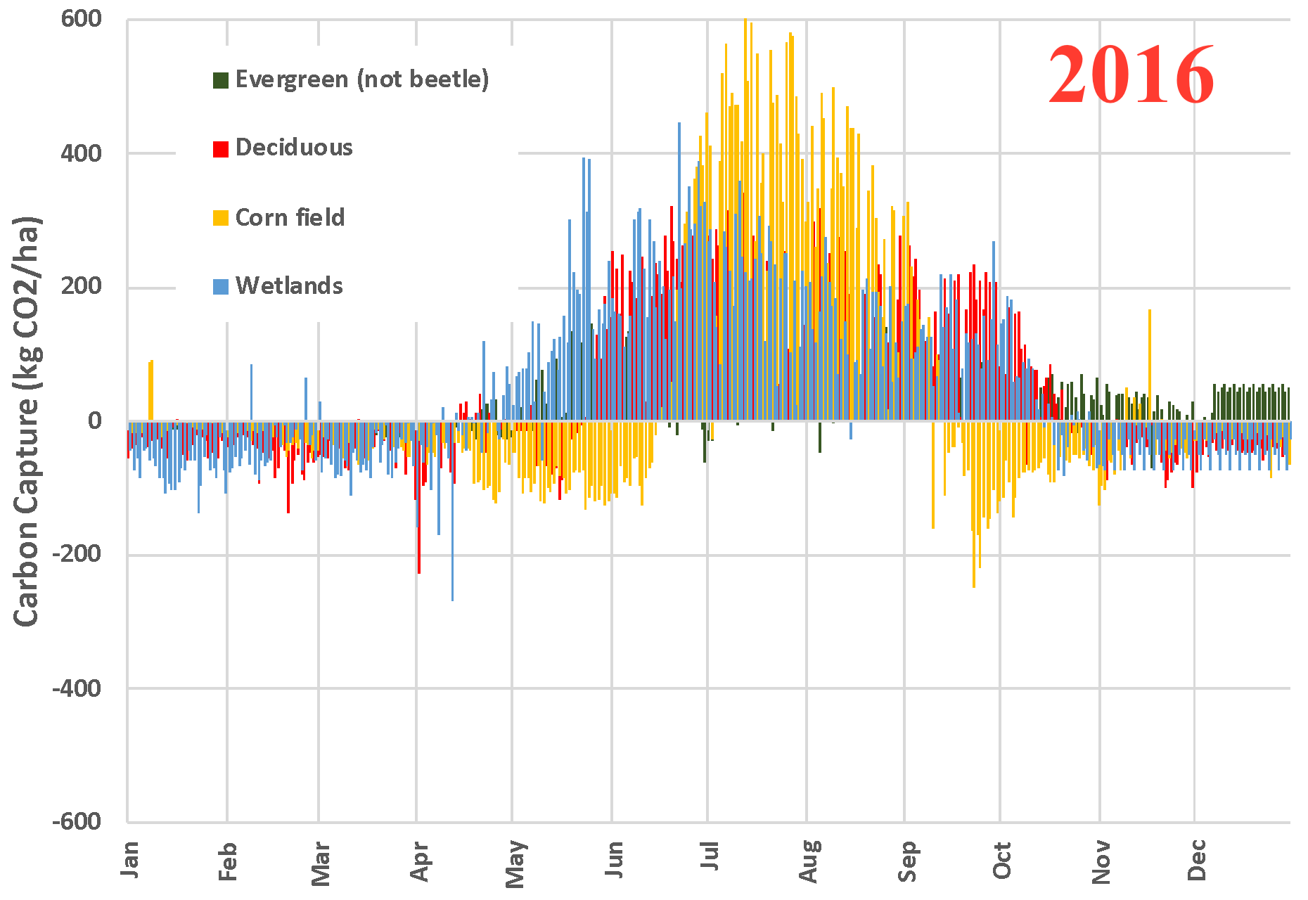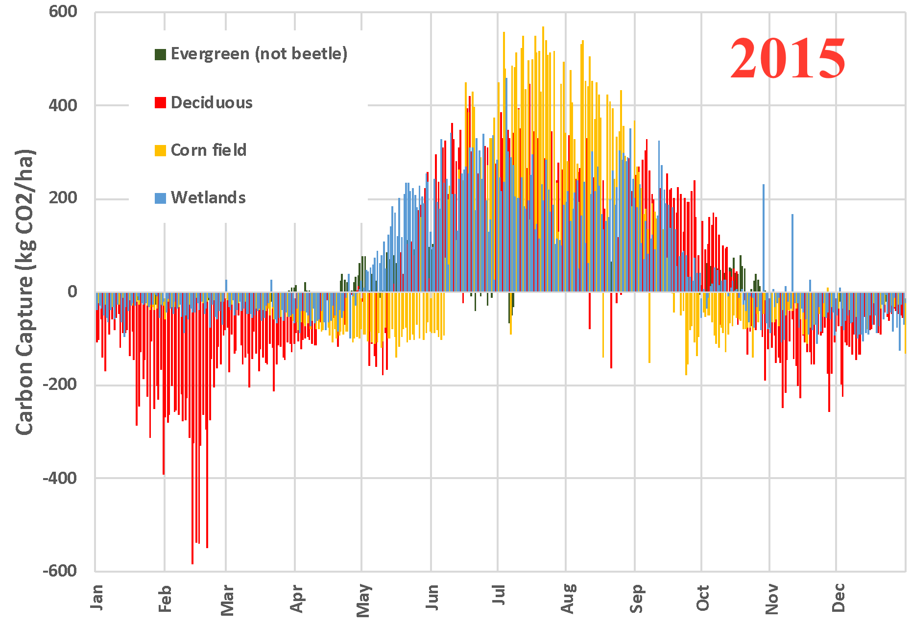 A clear “growing season” lasts from early spring to late fall, approximately May through October, when the ecosystem absorbs carbon dioxide. In natural ecosystems, net carbon capture starts as soon as the season begins. But, because corn is an annual crop that grows from seeds each season, there is a lag in the onset of absorption: When the land is bare (before the corn seedlings become established), there is a period where the cornfield releases CO2 while trees absorb it. But, during the summer months, when corn is actively growing, the cornfield absorbs about twice as much daily.