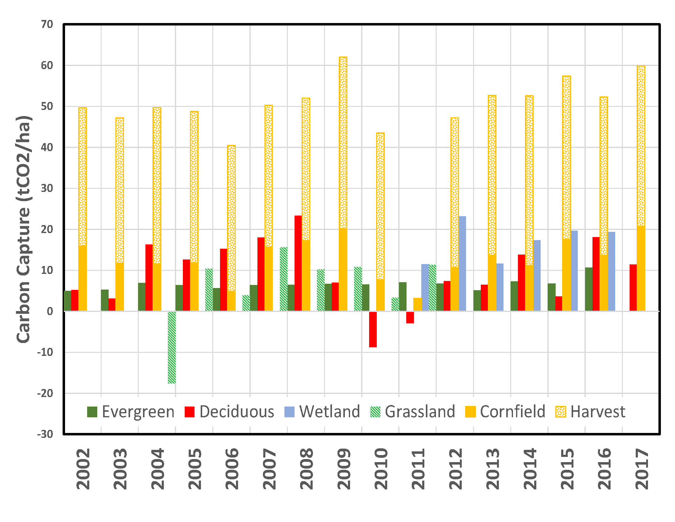 From this perspective, a few things have become more evident. To extract CO2 from the atmosphere, the best land use is an actively managed cornfield, mainly because carbon (in the form of grain) is harvested (removed from the system being measured). Of course, this doesn’t consider the carbon cost of active management, but such “carbon accounting” approaches are feel-good “offsets” that lead to economic net-zero rather than engineering net-zero. That’s a vital distinction, so I’m sticking with what is observed because that’s what counts. Most of the corn harvest is used for food, fuel, or feed, converting it back into CO2 but generating economic value in the process. For unmanaged lands, wetlands > deciduous forest > grassland > pine forest, a factoid that can also be explained in many ways. However, there’s no reason to believe this is anything more than an isolated trend since some years show a different rank order.