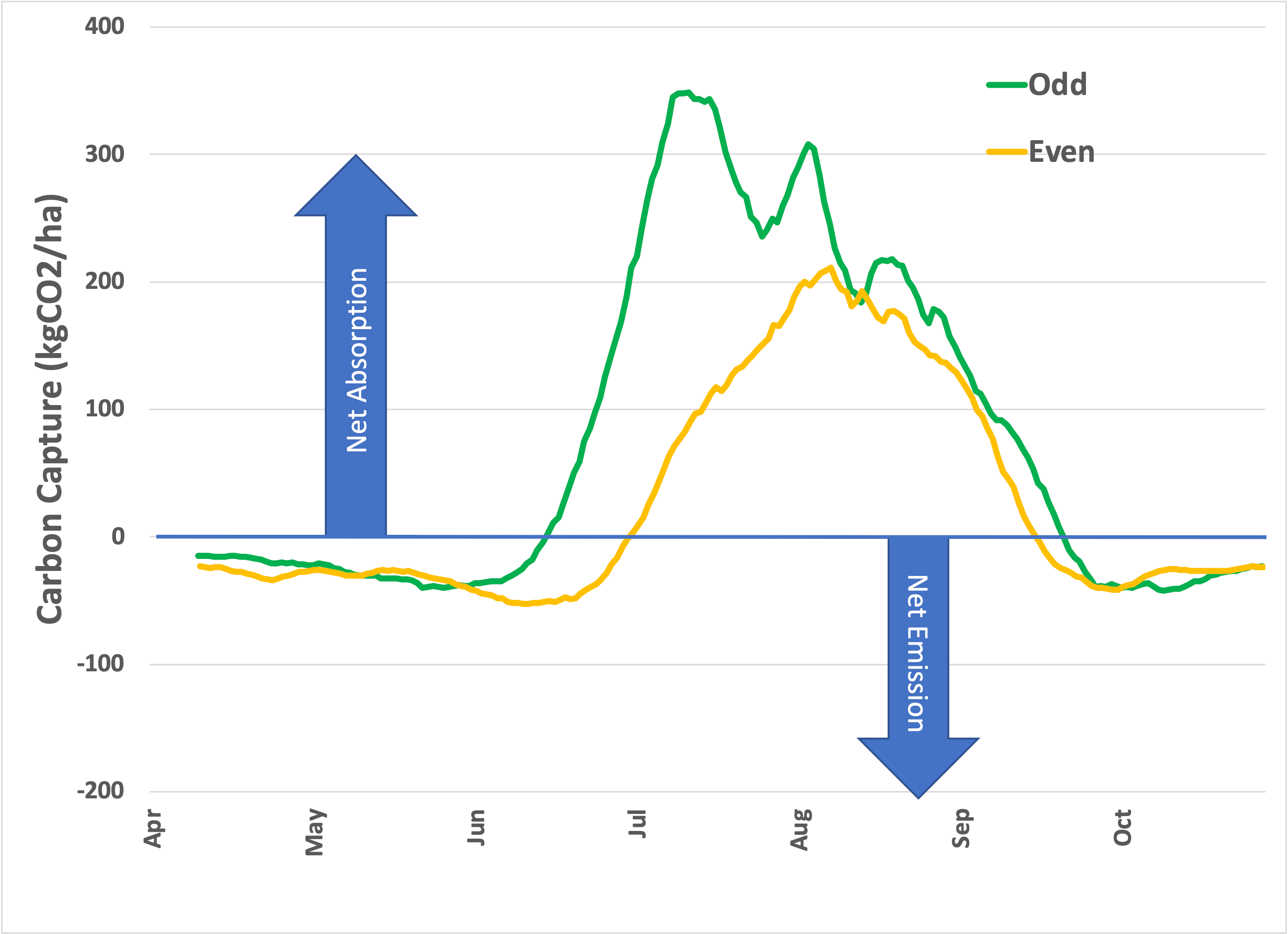Corn and soy are planted in the spring and suck CO2 out of the air all summer. As the crop matures, the plant stores the carbon in the harvested grain, and capture slows. The carbon in the harvest is removed from the field for human use (and out of the observed area).