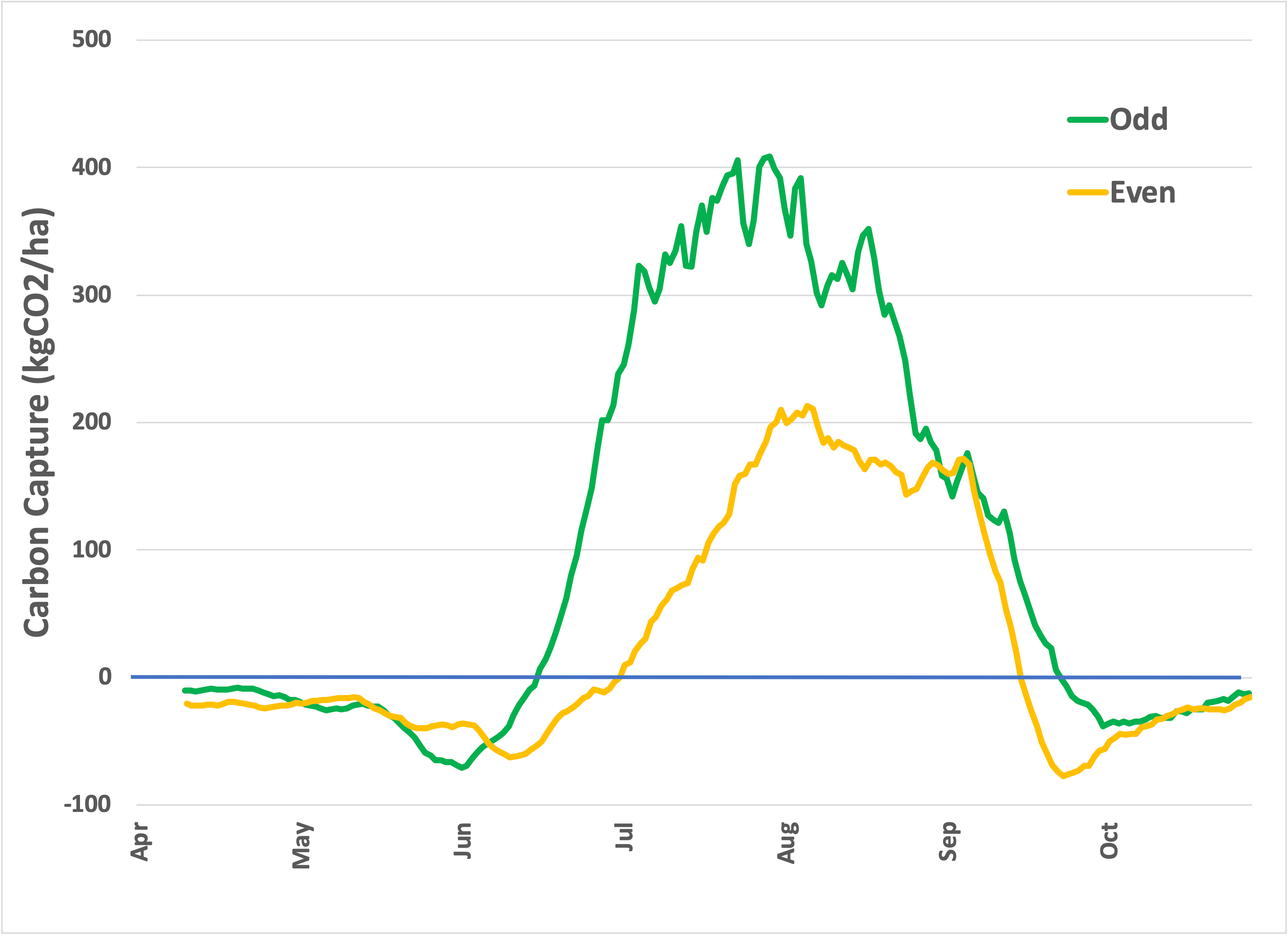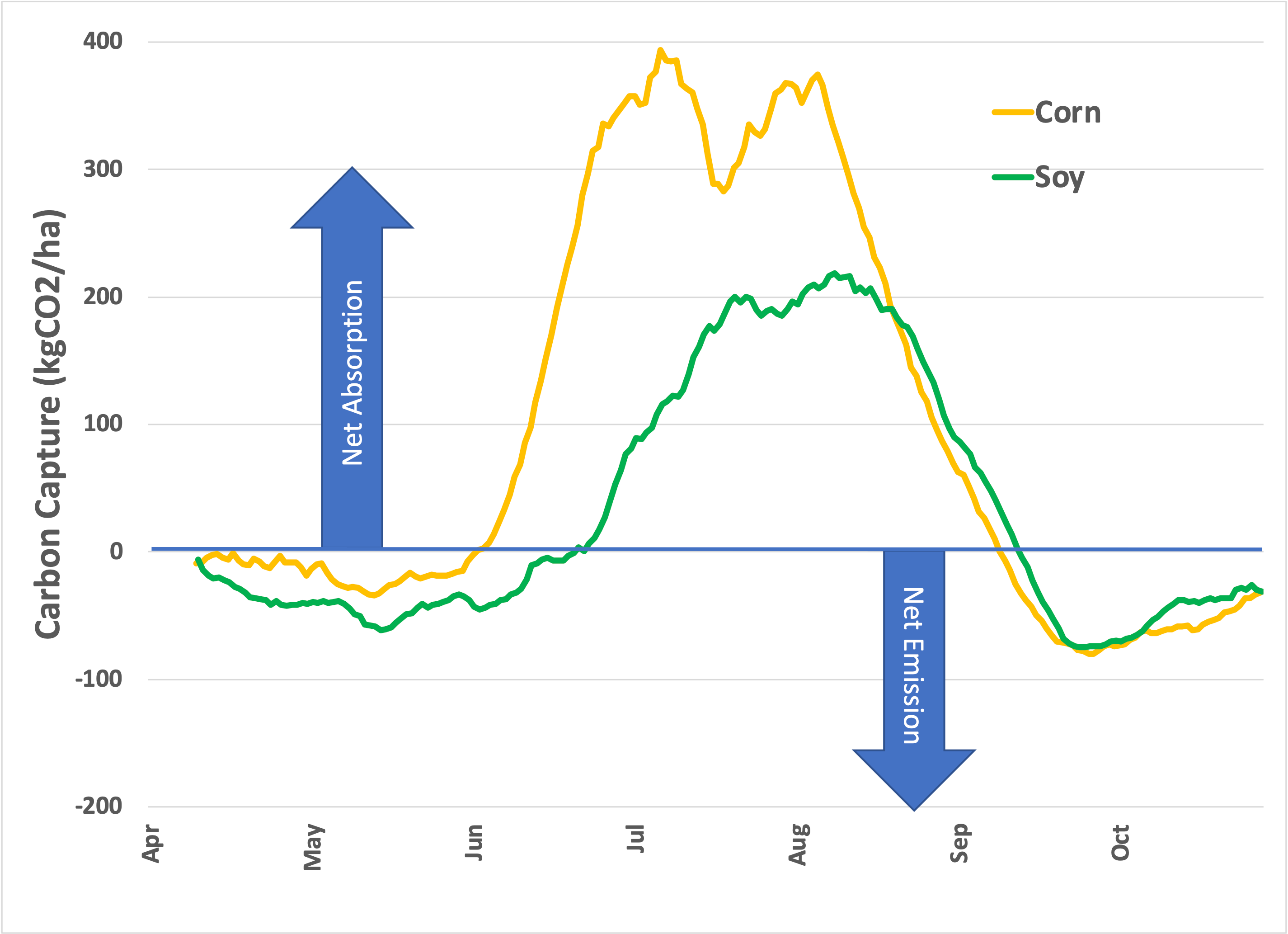 Corn and soy are planted in the spring and suck CO2 out of the air all summer. As the crop matures, the plant stores the carbon in the harvested grain, and capture slows. The carbon in the harvest is removed from the field for human use (and out of the observed area).