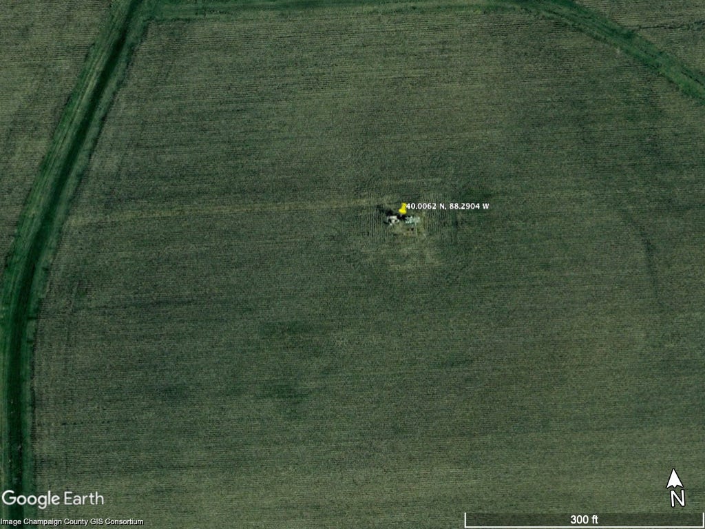 As it turns out, there are two ideal data sets to examine. Both data sets last for several years and look at a typical agricultural practice in the United States, known generally as the corn-soy rotation. In this practice, corn and soy are planted in alternating years in the same field to maintain soil health. As a result, we can compare data from the two crops directly without the usual ecological or geographic variables. One is a set of data 2 collected at one of my favorite research institutions, the University of Illinois, and (in part) by one of my favorite research scientists, Carl Bernacchi , who, long ago, explained the Eddy Flux Covariance method to me. His site is located in the middle of an Illinois field and looks like this from space: