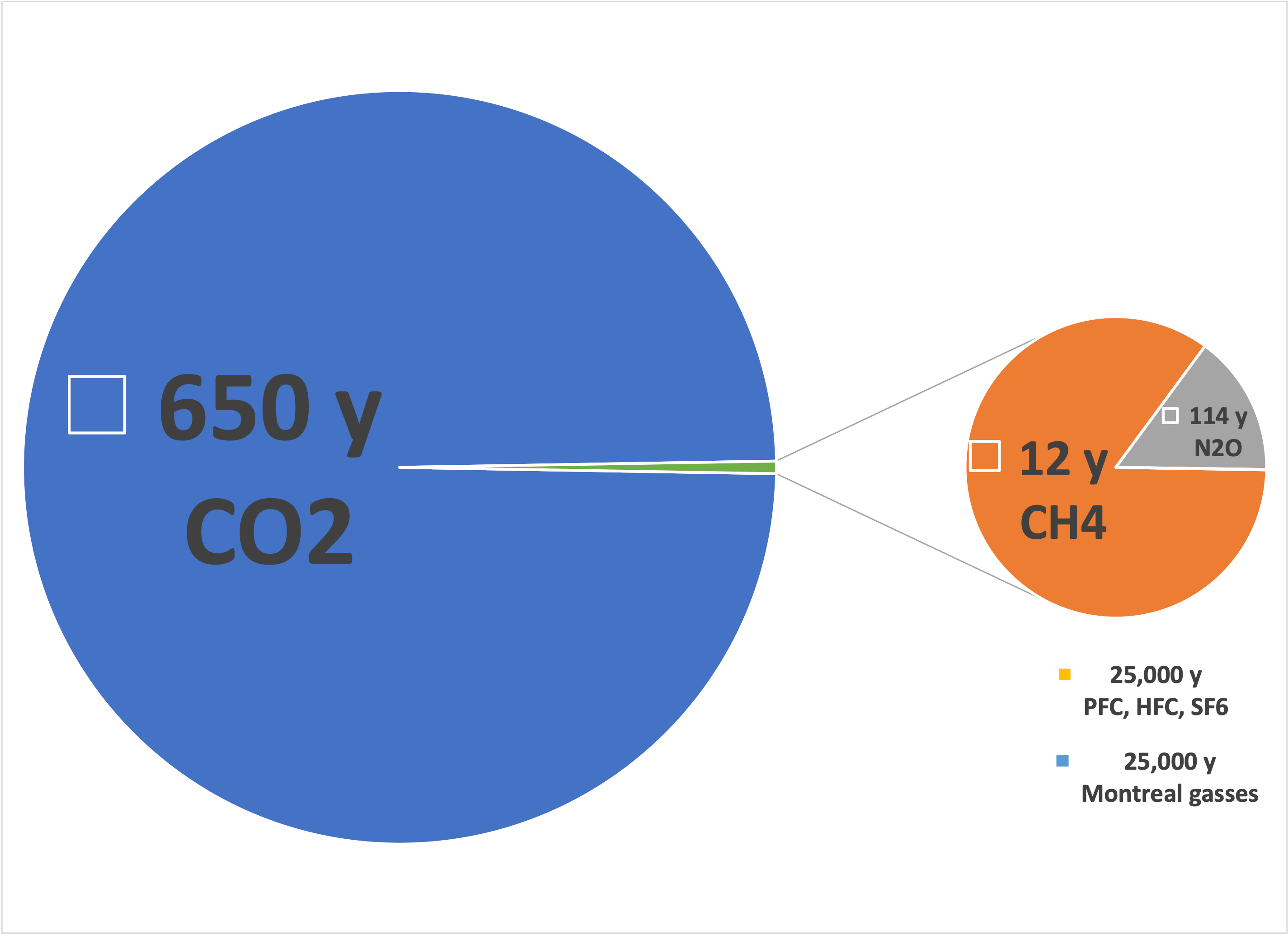 In the previous chart, the relative concentrations of GHGs and their estimated lifetimes (in years) are adjusted to “CO2 equivalents”. Here, CO2 is measured in hundreds of ppm while the longer-lived gases are in ppt, or a million times more dilute.