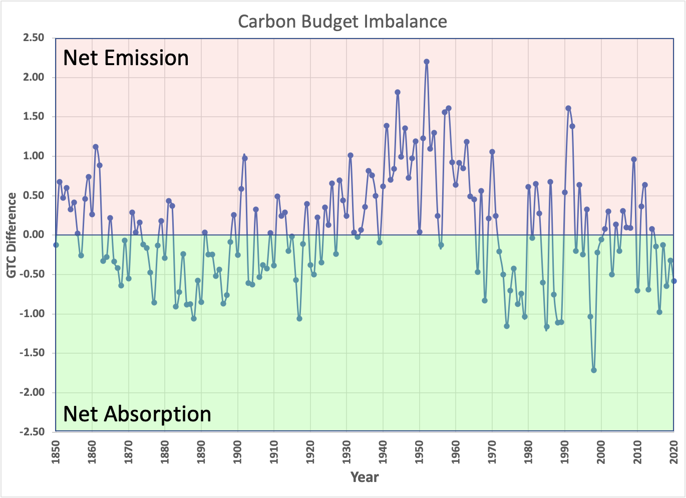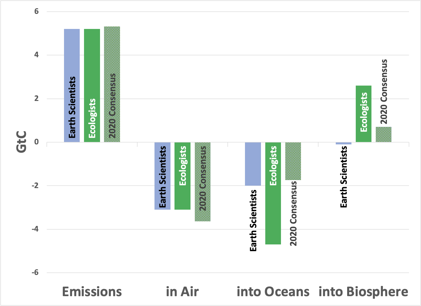 Before weighing in, let me put three stakes in the ground: First, Earth is a closed system, so the amount of carbon cannot change. It just moves from one reservoir to another. Second, the results compiled above are not measured directly; they’re estimated from contemporary world models. So, they can change; Because the first point is a Law of physical science, any difference must be a numerical error in the model. Finally, any terrestrial absorption model that doesn’t lead to the contribution of “biota” of zero before 1750 is simply wrong. We know that the CO2 level was constant for centuries despite the human appropriation of land for agriculture.