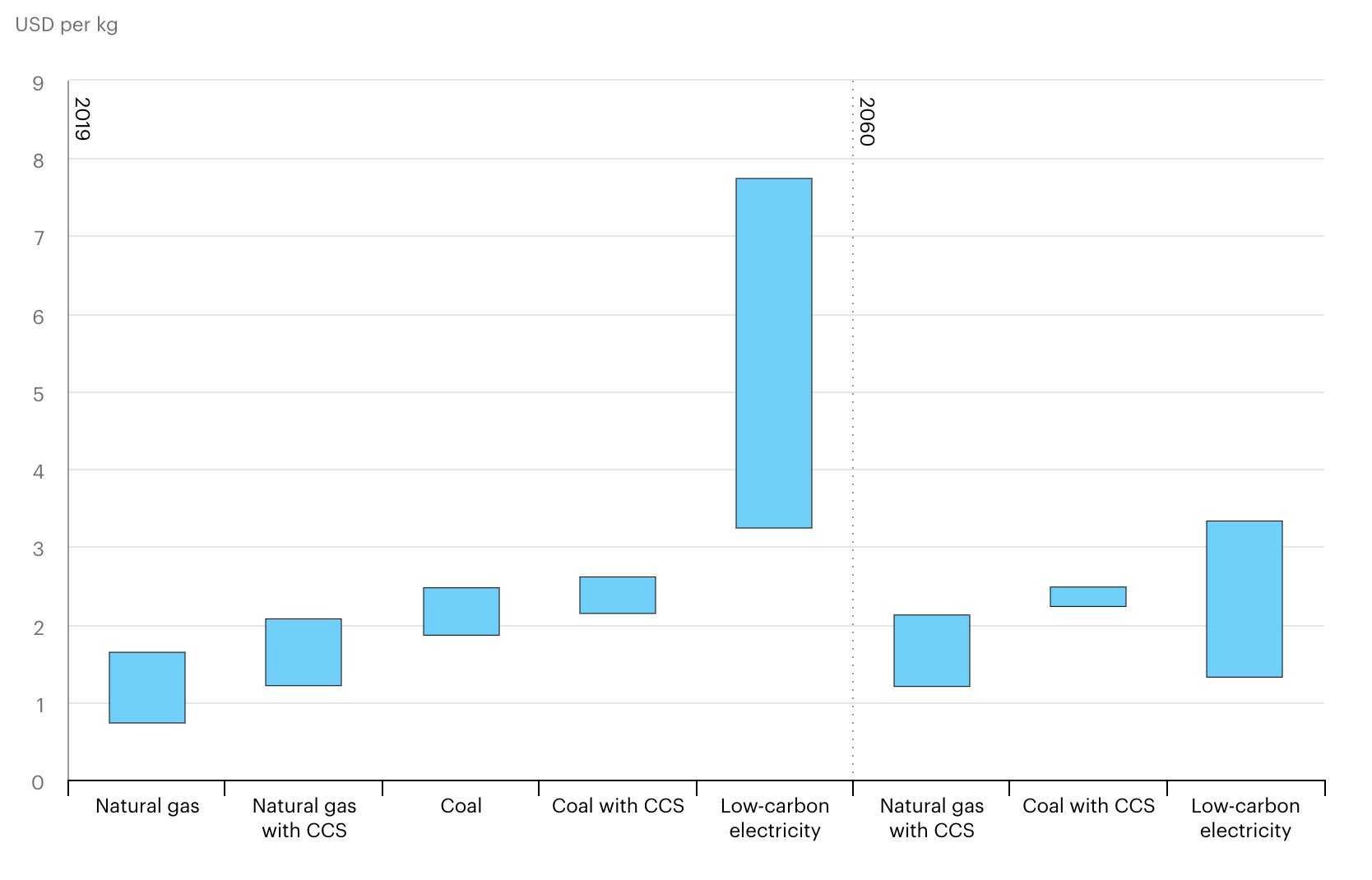While the added cost of about $0.50 per kg for CCS and the projected trends might seem believable, the numbers appear to assume a carbon market that raises the cost of stored carbon from $20-$35/ton to over $200/ton in 2060—and it’s got to be kept stored forever. Unfortunately, IEA hasn’t been entirely transparent—the source of the primary data and the assumptions needed to draw this chart are unavailable outside the figure.