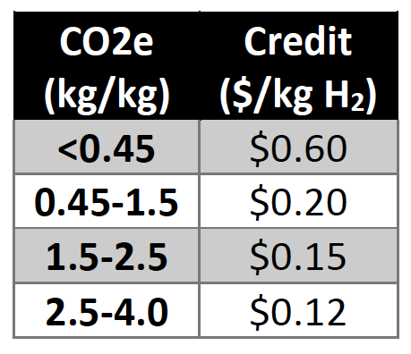 But the value of “clean” hydrogen depends on how “clean” it is! The legislation prescribes a progressive credit indexed to the number of CO2 equivalents the process emits. Here’s a table: