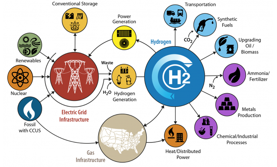 In response to Mr. Meyer’s opening, I would like to understand how this massive pot of money is being spent ( not ‘invested’! Give me a break.) So I figure it’s worth looking at hydrogen in the context of the three major bills passed in the 117th Congress. The regional hydrogen “hubs” were funded by the $8B in the Infrastructure bill, and, rolling out the funding announcement , the DOE provided the following graphic from a related initiative, the H2@Scale project, launched in 2016 (I think).