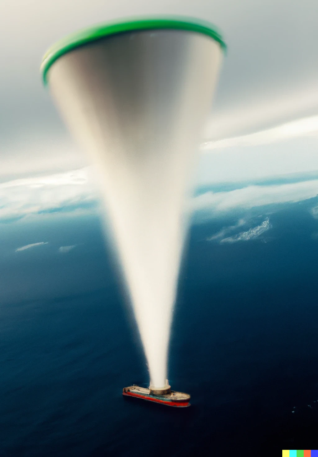 At the base of the funnel, one could imagine a Niagara Falls-like free flow of water. There, the water velocity is reported to be 32 feet per second or 22 miles per hour, so it’s consistent with a downpour. To prevent backing up because of flow, the area of the opening into the boat would need to be greater than the number of cubic feet per second divided by 32. That works out to an opening of about 12 square feet, about the area of a 4-foot diameter pipe. Not a show-stopper at all, even in a much heavier storm. A refined design might have an outlet as wide as the draft on the tanker (94 feet). This would reduce the sustained weight needed to be carried by the balloon.