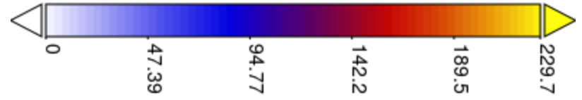How big a challenge does this pattern pose? Let’s ask another hypothetical. Suppose we put a collection point beneath each pixel of this map and asked how long (in days) it’d take to fill it—Based on the current design, that’s a cumulative 12 inches (305 mm) of rain. It turns out that the distribution looks like this:
