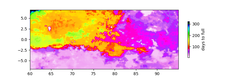 This plot is in millimeters per day for each day of 2022, starting on January 1, in the Indian Ocean near the Equator (between 60° and 95°E longitude). White, in this instance, reflects no rain. The color map shows increasing heat intensity (up to 9 inches per day). [I apologize for the slowness of the video. It was the default output (0.5 fps), and I didn’t have time to screw around with it. I recommend that you use the progress bar to scrub.] What you’ll see is that rainfall does seem to be spotty and somewhat seasonal.