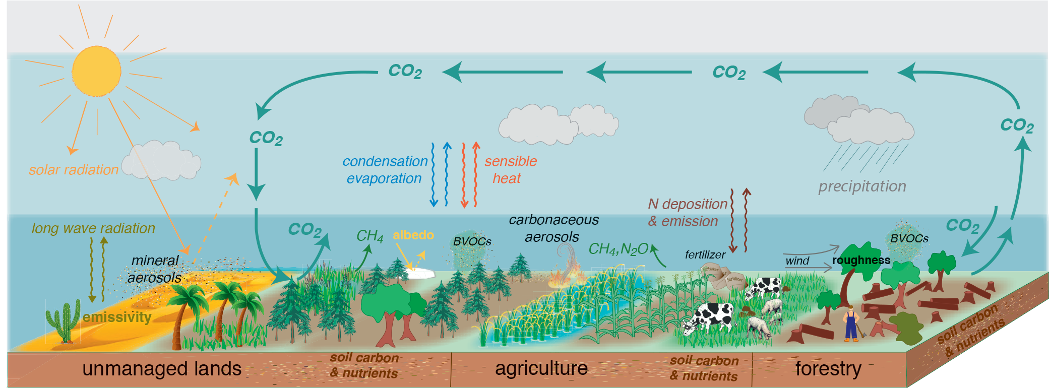 Changes in land conditions from human use or climate change in turn affect regional and global climate ( high confidence ) . On the global scale, this is driven by changes in emissions or removals of CO2, CH4 and N2O by land (biogeochemical effects) and by changes in the surface albedo ( very high confidence ). Any local land changes that redistribute energy and water vapour between the land and the atmosphere influence regional climate (biophysical effects; high confidence ). However, there is no confidence in whether such biophysical effects influence global climate.