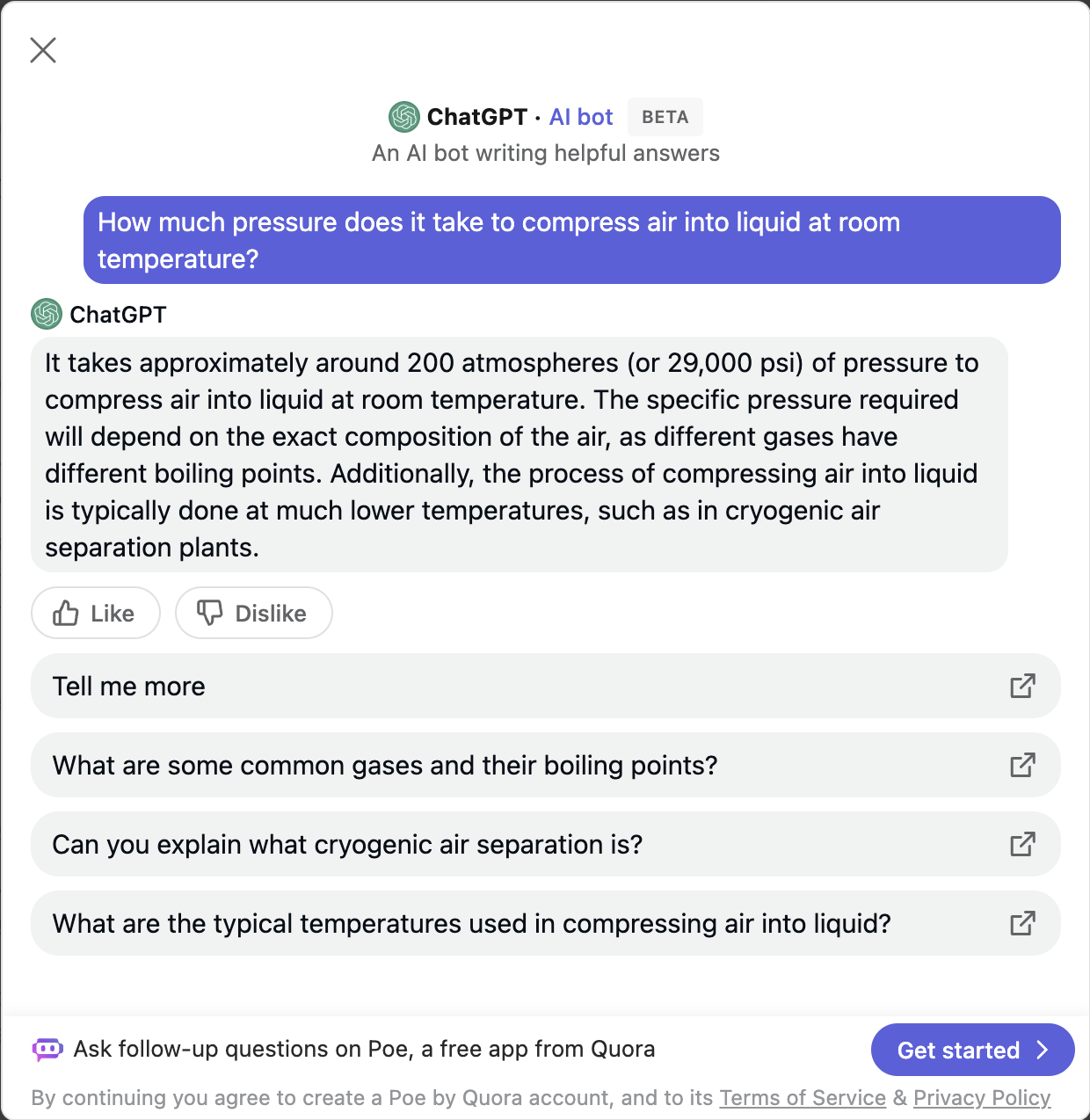 But that’s not the case. While looking up some background material on a different project, I encountered a Quora question, “How much pressure does it take to compress air into liquid at room temperature?” and the first answer, above all the human ones, was from ChatGPT (“in beta” as if that is a valid excuse for a lie). Here’s a screenshot: