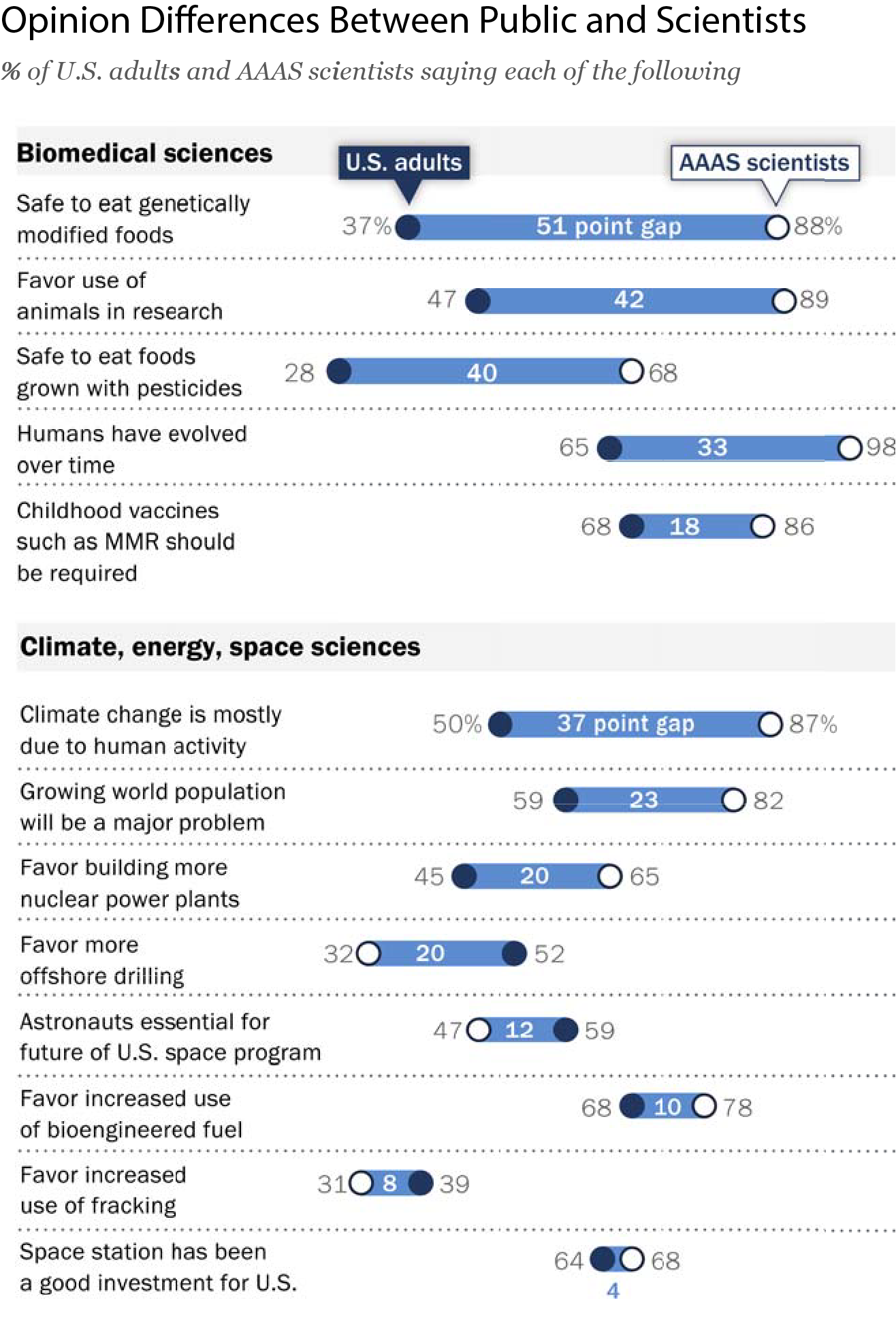 In 2015, the Pew Research Center conducted a public opinion poll that included members of the public and members of the American Association for the Advancement of Science (AAAS), a cross-disciplinary community of scientists. Here’s a summary chart from that report: