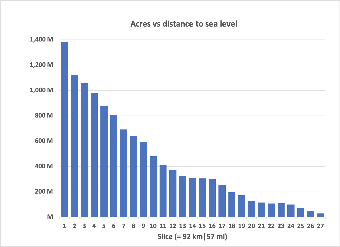 This shows that, at a global level, there are 2 to 2.5 billion acres of arid land within about 100 miles of the ocean. In a future analysis, it will be helpful to analyze elevation changes, but let’s take that as the addressable area using this approach.