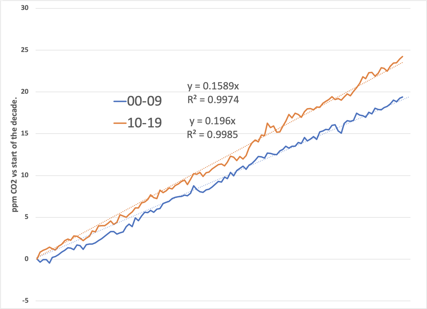 During the 2000-2009 period, the atmosphere increased by about 0.16 ppm per month. During the 2010-2019 period, the atmosphere increased by about 0.2 ppm per month.