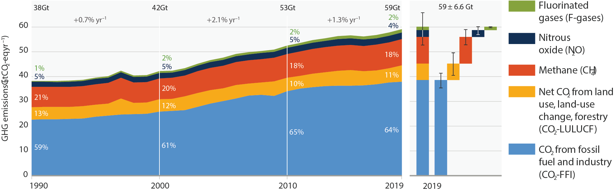 Total net anthropogenic GHG emissions have continued to rise during the period 2010–2019, as have cumulative net CO2 emissions since 1850. Average annual GHG emissions during 2010-2019 were higher than in any previous decade, but the rate of growth between 2010 and 2019 was lower than that between 2000 and 2009. (high confidence)