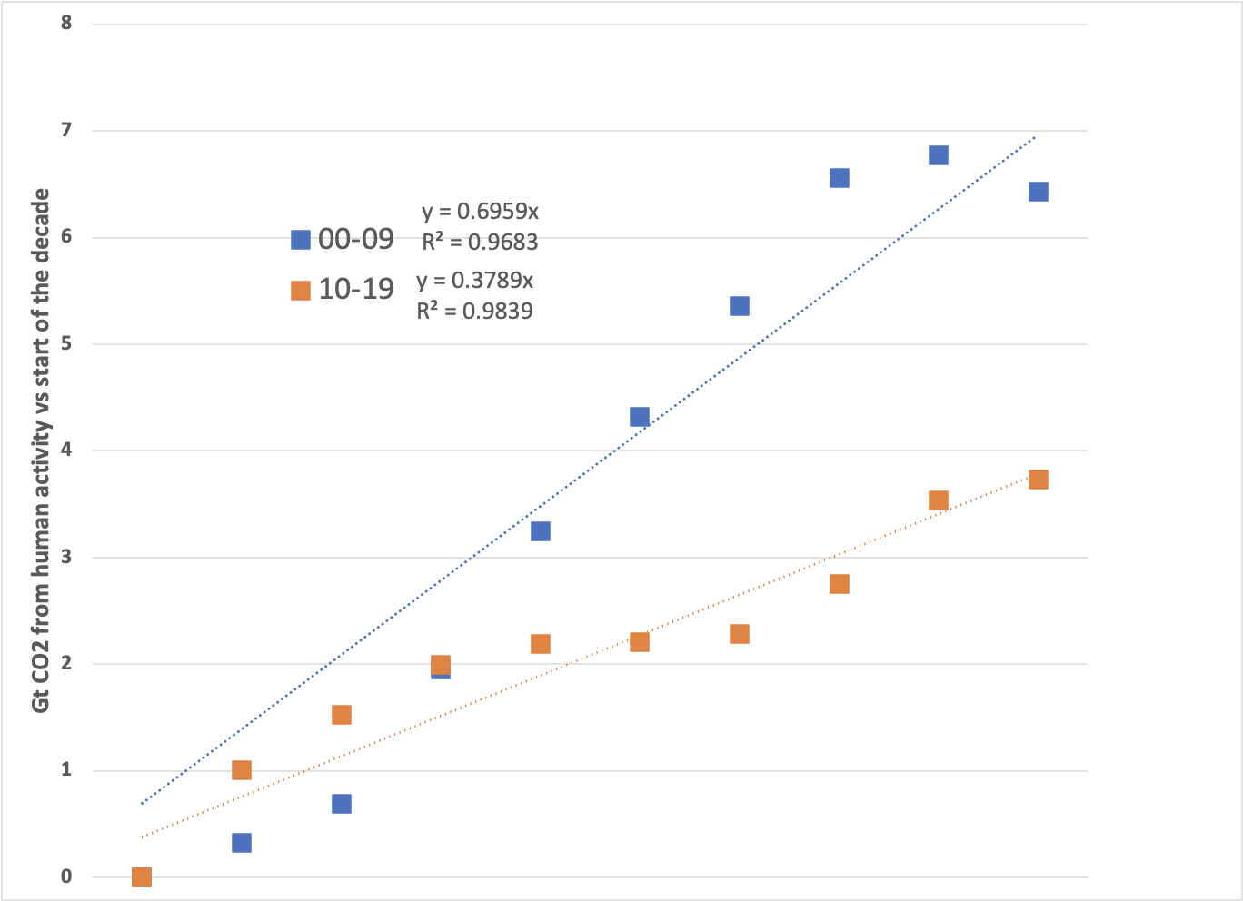 Nevertheless, I can speculate that a change in awareness or sense of importance between the two decades has led to a more careful (or possibly more selective) accounting of carbon emissions. It’s also possible that there are “forcing” factors that amplify past emissions through natural processes beyond what humans contribute. If that’s true, though, we’re in deep trouble because it would mean that consciously reducing human emissions in practice has no effect (on a decade time scale) on rising CO2 levels.