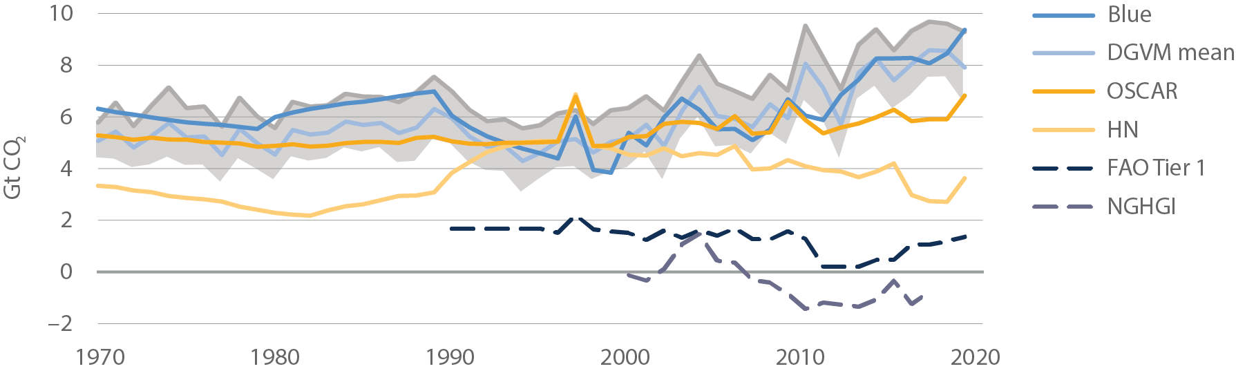 So, what can we discover if we take LULUCF data from the summary chart? Removing that feature doesn’t affect the IPCC’s conclusion. For the decade ending in 2009, the average annual increase was 2.3%, and for the decade ending in 2019, the average yearly increase was 1.5%. The primary component, CO2, shows the same apparent slowing.