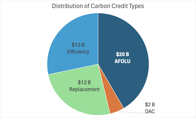 To estimate the amount of money involved, I downloaded publicly available lists of active projects that have generated carbon credits from the top four sellers: Verra, Gold Standard, Climate Action Reserve (CAR), and American Carbon Registry (ACR). Each registry has its classification system, so condensed them into four categories: AFOLU, Direct Air Capture (DAC), Replacement, and Efficiency. Based on the carbon credits sold so far, here’s how much money has changed hands: