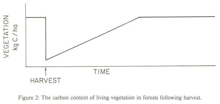 While the amount of carbon in a given land area (as seen in the figure above) naturally decreases with harvest, is an undisturbed ecosystem really at a steady state?