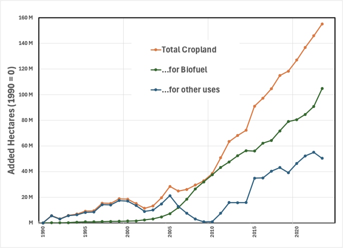 iLUC advocates assert that the land under cultivation increases proportionally as more land is used for biofuel production. Any comparison will be flawed, but since I haven’t actually peeked to see the answer, it’ll be educational for you and me both. I believe it’s a worthwhile comparison since if an increase in biofuels isn’t correlated to a proportional (and significant) increase in land use for agriculture, then iLUC is fatally flawed, environmentalist claptrap.