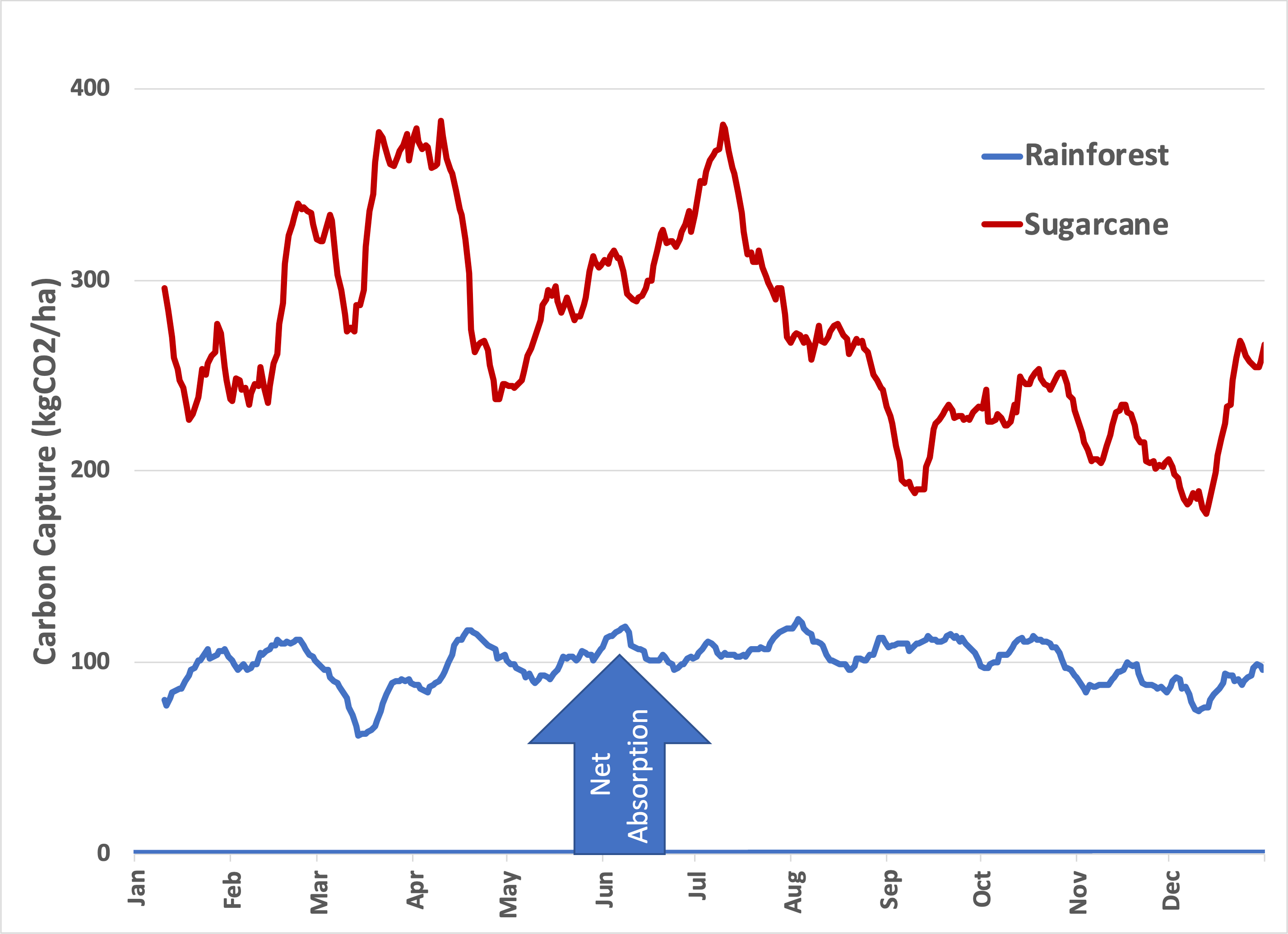 No. They do not. First of all, the two plots describe different things: The net flow of carbon from the atmosphere into the ecosystem below is measured, while the model accounts for how much carbon is present in the above-ground vegetation. The two measurements are related in the same way your paycheck affects your checking account—the books have to balance. So, looking at the forest data, models must account for what happens to the 100 kg CO2 per hectare per day of carbon dioxide that is absorbed, and they don’t. This carbon must end up somewhere because the rainforest couldn’t grow that fast 3 . We know it’s not released into the atmosphere or converted into vegetation. The only reasonable place left is underground, as stable soil organic carbon or as inorganic carbonates that leach with water flow.
