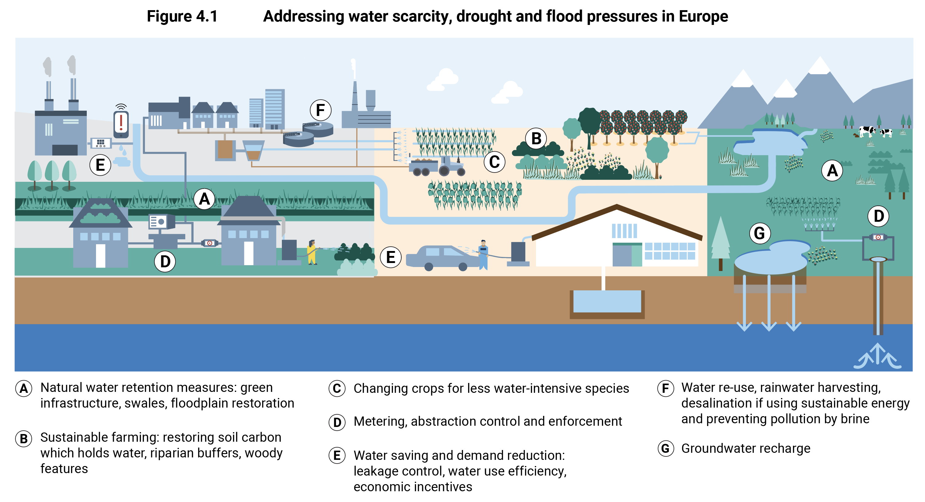 Finally, she cites a report by the European Environment Agency, part of the EU bureaucracy. Southern Europe (Spain, Italy, and Greece) is arid yet has access to the Mediterranean Sea. Yet, desalination (despite being actively pursued by these member states) is discounted chiefly as being an energy hog (dirty!) and producing brine waste (harms fish!). Given that the document starts by pointing to a Water Framework Directive goal intended to be met nine years ago yet remains unfulfilled, I suspect it’s another policy-heavy, science-light tome. It does come with a good figure that summarizes the situation, though: