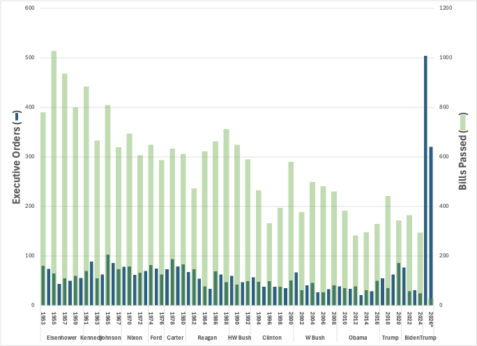 Limited quantitative evidence now confirms what began as a hypothesis: we’re witnessing a fundamental restructuring of governance relationships in both the private and public sectors. The current administration has issued over 100 executive orders in the first 10 weeks, twice the historical average of 50 per year since 1953. If this pace continues, Trump will have issued an extraordinary number of EOs in his first year. In contrast, the 119th (current) entirely Republican Congress has passed only four bills, on its way to being the least productive assembly in my lifetime.